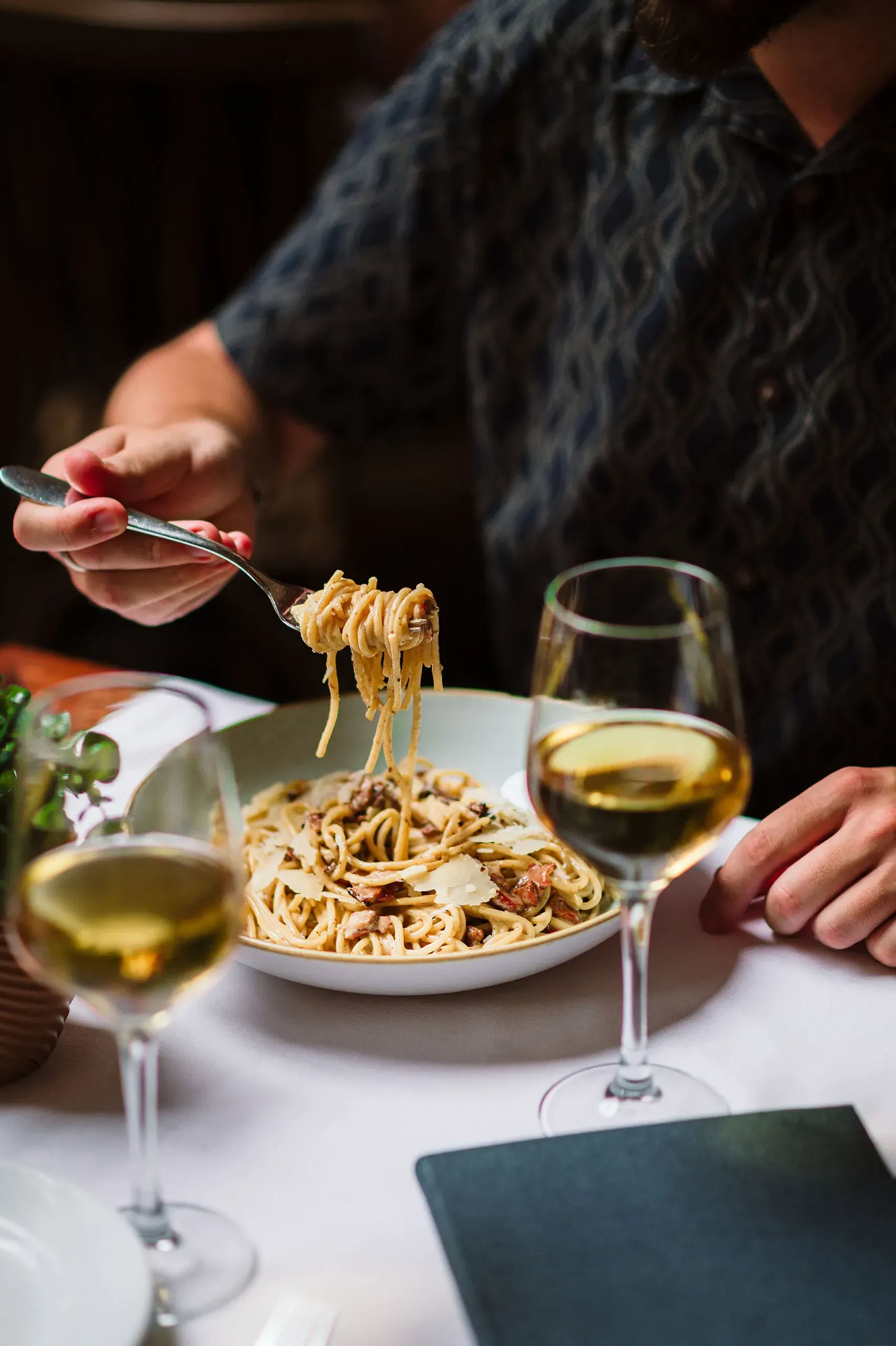 - Spaghetti alla carbonara (guanciale, crema, huevo y parmigiano reggiano: 15,90