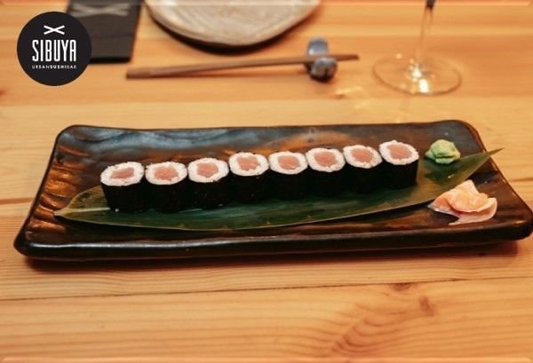 Salmón, aguacate, pepino y queso crema cubierto de sésamo y tobiko naranja.