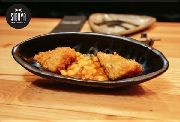 Cebolla tempurizada, queso crema y aguacate cubierto de sésamo, wakame y salsa miel y mostaza.