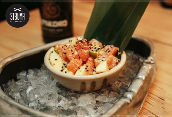 Salmón y manzana en pequeños tacos, ikura y salsa sibuya.