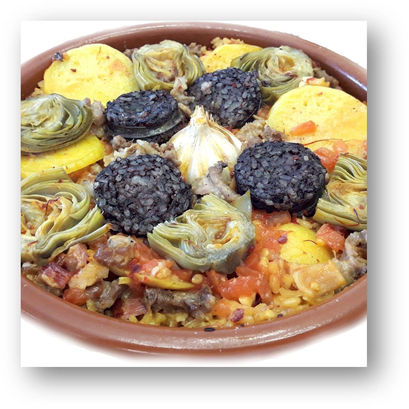 Arroz bomba, carne de cerdo, morcilla, garbanzos, patata, una cabeza de ajos.