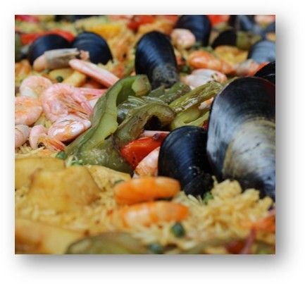 Paella de marisco con arroz bomba, langostinos, almejas, calamares, mejillones